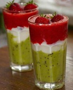 По отдельности измельчите в блендере клубнику, киви и банан. Аккуратно, не смешивая, выложите в бокалы сначала слой киви, затем банан, затем клубнику. Поставьте в холодильник на полчаса, подавайте холодным