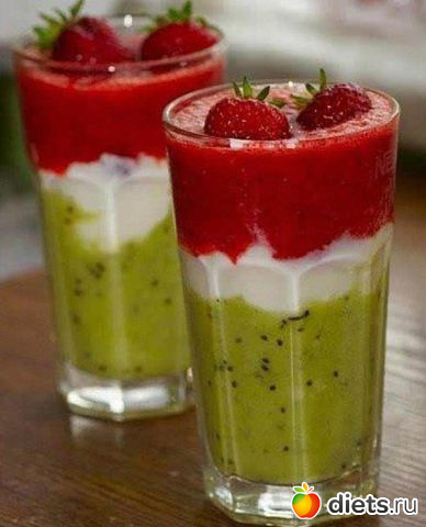 По отдельности измельчите в блендере клубнику, киви и банан. Аккуратно, не смешивая, выложите в бокалы сначала слой киви, затем банан, затем клубнику. Поставьте в холодильник на полчаса, подавайте холодным Читать полностью