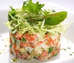 Приготовление: Отвари и почисти картофель и яйца. Нарежь кубиками огурцы, лук, яйца и картофель. Выложи все в миску. Филе семги нарежь небольшими кубиками. К нарезанным овощам добавь зеленый горошек и измельченную петрушку. Выложи семгу. Посоли и поперчи. Смешай 150 г сметаны с икрой и заправь полученным соусом салат. Укрась рукколой. Приятного аппетита!