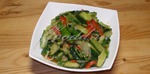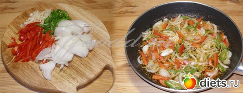Прожарьте лук, добавьте к нему перец зеленый, перец болгарский и жарьте все вместе 2-3 минуты. Добавьте к заправке чеснок, молотый кориандр, черный молотый перец, красный молотый перец и все хорошо перемешайте. Выключите плиту.