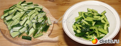 Нарежьте огурцы продолговатыми узкими полосками. Обильно посолите и немного помните их, словно месите тесто. Оставьте на 10 минут, чтобы соль впиталась и огурцы дали сок.
