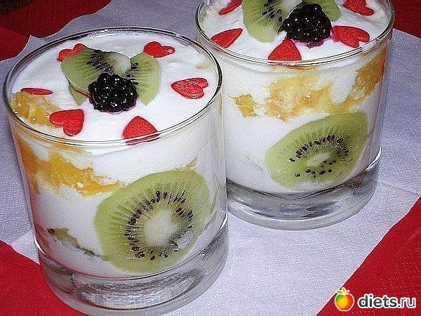 Так повторять столько, сколько необходимо. Последним в десерте творожном должен быть слой с творожной массой. Украсить оставшимися кружочками разных фруктов.