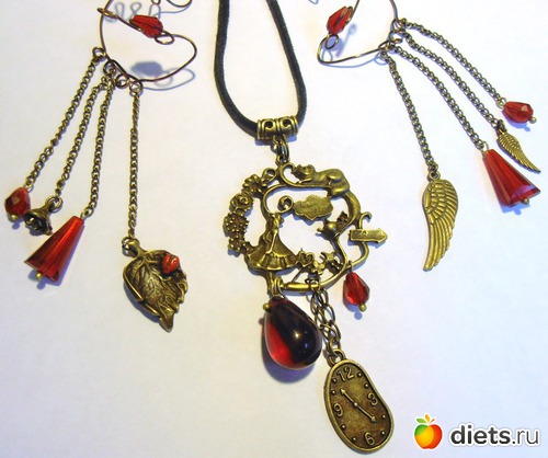 Под внезапно проснувшееся вдохновение сотворила набор из самых любимых мною подвесок. Каффы специально сделаны несимметричными, один с пёрышками, другой с розочкой и листиком. Подвеска с Алисой на кулон уже была готовая, но я подобрала к ней бейл (держатель), добавила к ней часики и ещё моих любимх красных бусин.
