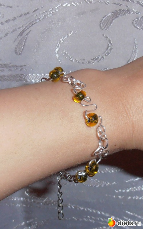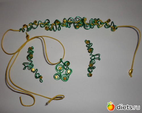 2. Салатовая паутинка. Набор сделан на подарок по примерному описанию. Медная проволока с покрытием серебряного цвета и чешские стеклянных бусин.