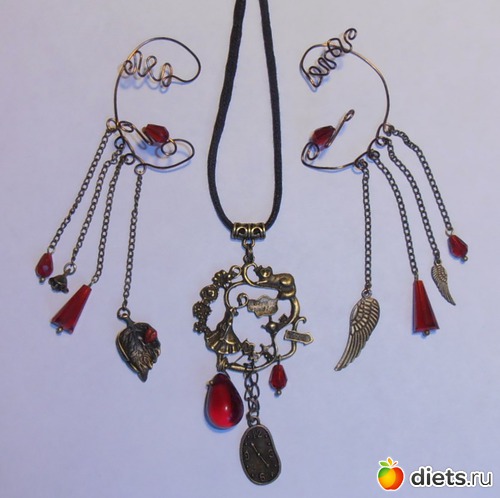 Под внезапно проснувшееся вдохновение сотворила набор из самых любимых мною подвесок. Каффы специально сделаны несимметричными, один с пёрышками, другой с розочкой и листиком. Подвеска с Алисой на кулон уже была готовая, но я подобрала к ней бейл (держатель), добавила к ней часики и ещё моих любимх красных бусин.