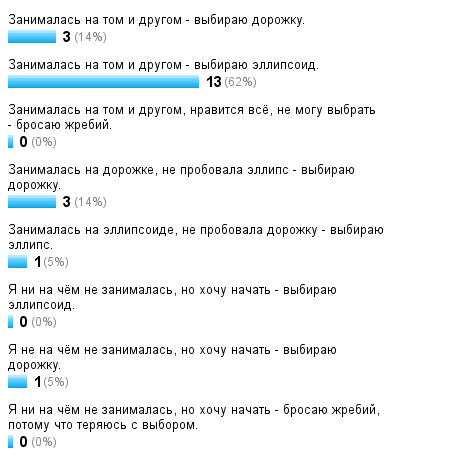 Наверняка такие темы уже были, но не сочтите за навязчивость и примите, пожалуйста, участие в очередном, стотысячном опросе, что же предпочесть для домашних кардио тренировок - дорожку или эллипсоид. Лично я определилась вчера, а вот Иришка (romahska) в растерянности и ваши ответы, возможно, помогут и ей сделать правильный выбор.