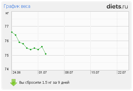 Вес сегодня 75,1, т.е. со вчера отвалилось 500 грамм. Но это все потому что закончились КД, слилась запасенная организмом жидкость и начался новый похудательный период