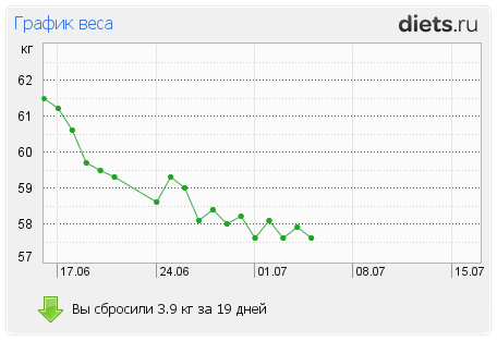 с понедельника, как вес достиг 57,6, у моего организма видимо жесткая борьба за каждый грамм, вместо обычных качелей, с тенденцией понижения, вес отчаянно то в верх немножко, то на те же злополучные 57,6)))) уже 3 раза было 57,6 и ни на 100 грамм меньше. Выходные будут овощные, но я все же надеюсб то во вторник после белкового дня я хоть немного опущусь.