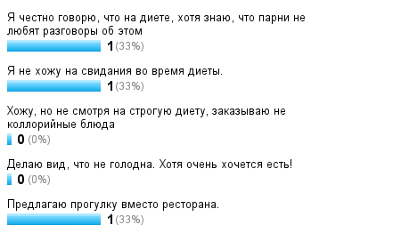 p.s. отказываюсь от свиданий в ресторане.. так как стыдно как то заказывать только воду.. тем более поклонник из италии не понимает, ведь они все любят покушать и я в Италии ела все подряд ))) А сообщать о диете мужчинам, как то не этично, тем более все в один голос начинают кричать: тебе не надо худеть, ты итак прекрасно выглядишь... Змеи-искусители, епрст, как вы поступаете, если идете на свидание или на встречу, как хитро отводите искушение и отговориваете от ресторана? Где тогда назначаете встречу?