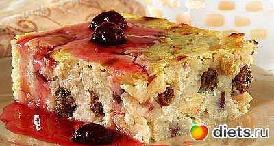 Рис переберите, промойте и сварите рассыпчатую кашу на разбавленном водой молоке(можно варить на воде-калорийность уменьшится). В охлажденную до 60-70 С кашу добавьте протертый творог, взбитые с сахаром в пышную пену 2 яйца, ванилин, перебранный и припущенный изюм и очищенные от кожицы и семян и нарезанные кубиками яблоки. Всё перемешайте и выложите в смазанную маслом и посыпанную сухарями форму. Поверхность смажьте сметаной, смешанной с яйцом, и запекайте в духовке при 220-230 С до образования золотистой корочки. Перед подачей разрежьте запеканку на квадраты. Для семьи-полейте вареньем... для себя-съешьте с черным кофе без сахара.