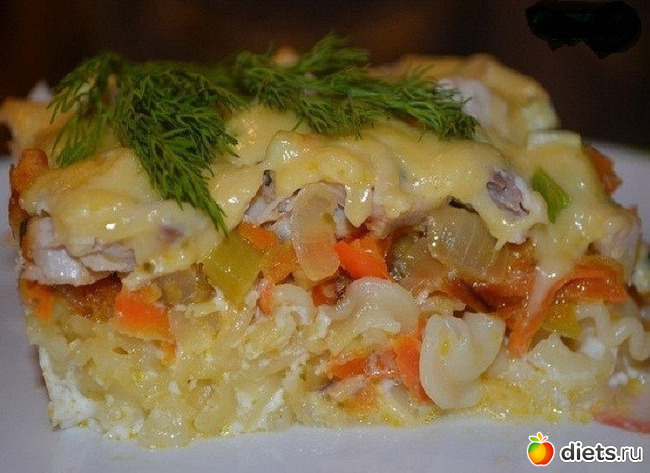 6. В форму выкладывать слоями: макароны, овощи, мясо, залить молочной смесью. Запекать 30-40 мин при 180.