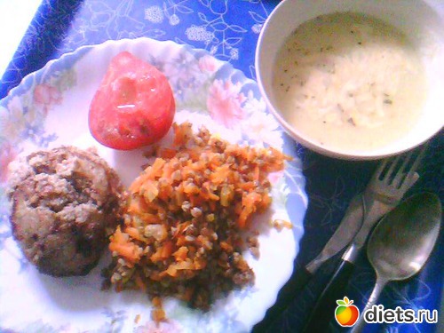 Обед состоял из супа-пюре из цветной капусты (сверху - чуть-чуть тертого сыра), котлетки и гречки с тушеной морковкой и помидором: