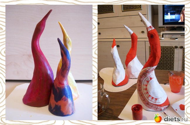 Потом из пластилина я вылепила примерную форму будущего изделия. Следующим этапом стало изготовление птиц из папье маше в натуральную величину. На них я экспериментировала и придумывала орнаменты…