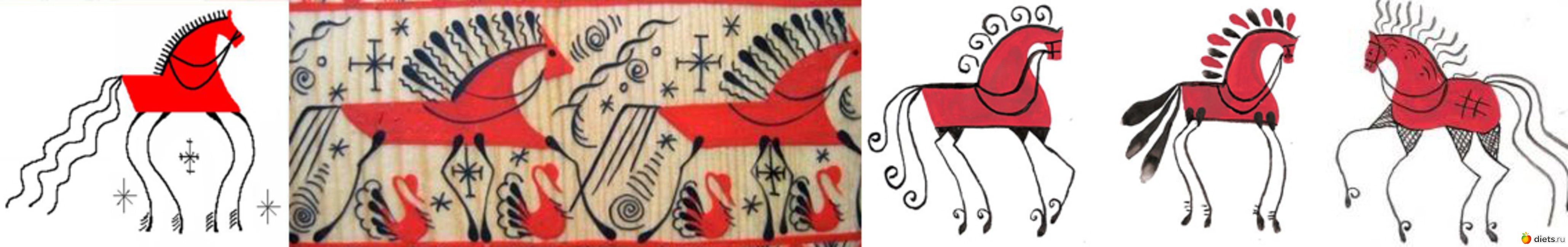 Так же, лошади, если одна окрашена в чёрный, а другая в красный цвет, следующие друг за другом, олицетворяют загробный и сущий миры.