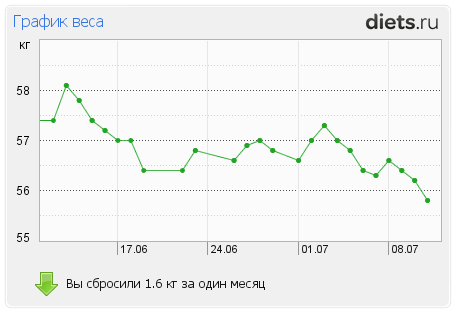 Ура, на весах сегодня неожиданно появились 55.8 кг! Понятно, что скачки вверх еще будут, но начало положено! С 11 июня по 11 июля ушло 1,6 кг - на подсчете БЖУК и необременительных тренировках. Последнюю неделю вообще не занимаюсь спортом - пока не научилась правильно нагружаться в связи с новым диагнозом, но вес неуклонно идет вниз - спасибо правильному питанию!