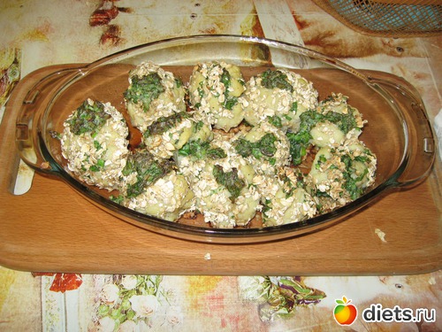 Огнеупорную стекляную форму для запекания я смазала оливковым маслом чисто символически. Уложила эти ёжики туда и поставила в нагретую до max духовку. Запекала 20 минут.
