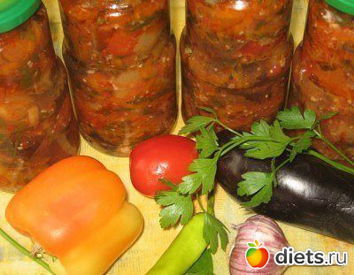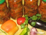 Способ приготовления: Нарежем небольшими кубиками помидоры, добавим рубленый чеснок, мелко нарезанный горький перец, нарезанные кубиками баклажаны, сладкий перец, лук, натертую на терке морковь, масло, соль. Тушим после закипания 45-50 мин. Затем добавим уксус, поварить еще 5 мин. Разложим сразу в стеклянные стерилизованные банки и закатаем железными крышками.