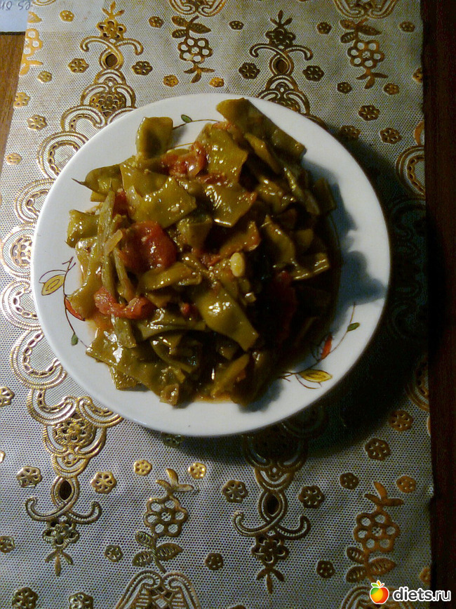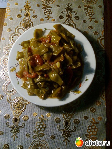 Обед в 14.00_как ни странно я проголодалась. Тушеная зеленая фасоль с помидорами и 2 яблока, вода 300 мл