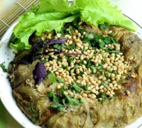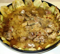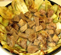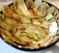 Пока вариться мясо, баклажаны почистить, порезать в длину но не очень тонко, посолить, дать постоять 10 минут, промыть обсушить, и обжарить с двух сторон. Выложить на салфетку, что бы впиталось лишнее масло, можно слегка обмазать чесноком.