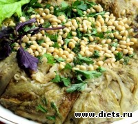 Затем ставим на кастрюлю блюдо и резко переворачиваем кастрюлю. Посыпать вверх кедровыми орешками, зеленью