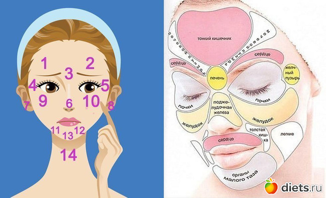 6: Сердце - проверьте ваше артериальное давление и уровень витамина B. Уменьшите потребление острой пищи, сократите потребление мяса и больше бывайте на свежем воздухе. Кроме того, необходимо снизить уровень холестерина, заменить «плохие жиры» на «хорошие». В орехах, авокадо, рыбе и льняном семени содержаться полезные Омега-3 и Омега-6.. Кроме того, поскольку эта область насыщена расширенными порами, убедитесь, что причиной появления прыщей являются не старый макияж и просроченная косметика.