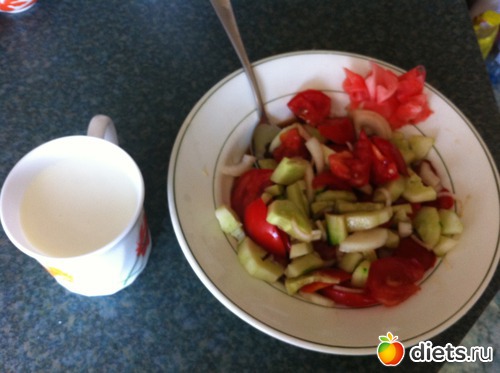 Обед: в наказание за завтрак, он был очень легкий. Салат из одного помидора, огурца и половинки репчатого лука, маринованный имбирь в прикусуку, заправка ложка соевого соуса, кефир 3,2 стакан 200 мл