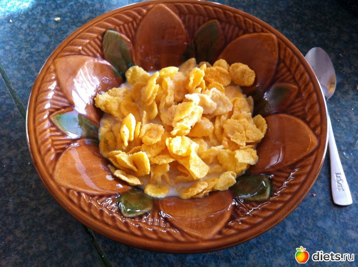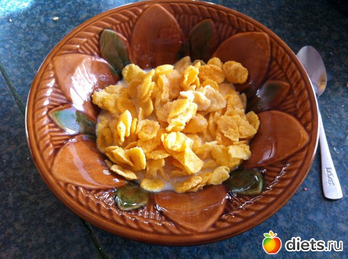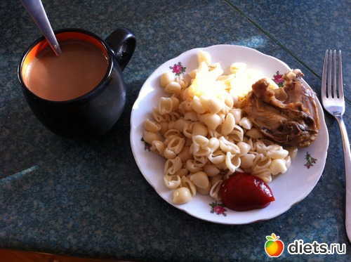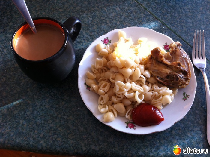 Завтрак: кукурузные хлопья с молоком (две столовых ложки), макароны, тушеная курица, ложка кетчупа, кофе с молоком и сахаром, и еще две ложки кабачковой икры они в фото не попали))))