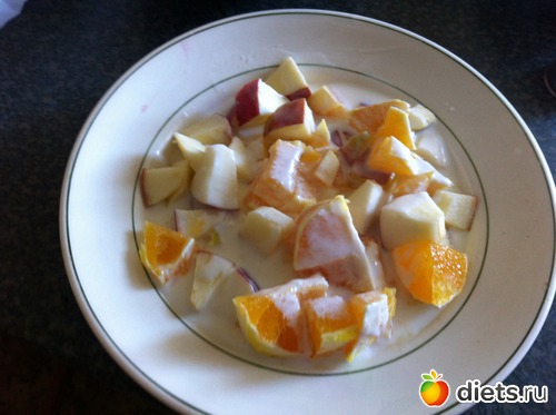 Ужин: одно яблоко, один апельсин все нарезать и залить стаканом кефира. Ужин был в пять, в семь съела пословинку грейпфрута, после зеленый чай, лучший утолитель голода.