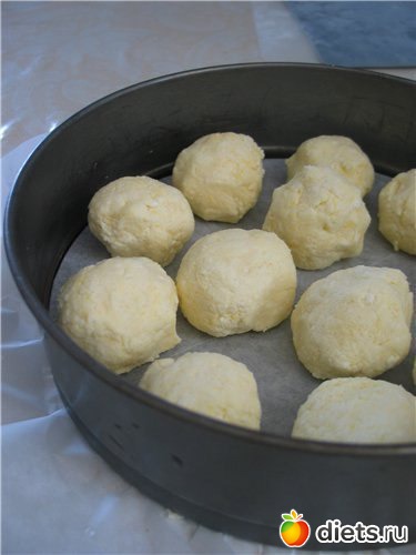 Форму для выпечки застелить пергаментной бумагой, выложить шарики.