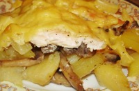 Эх сколько раз каждая жена, просидев в интеренете с ужасом смотрела на часы ипонимала, что муж придет через час, а ужина нет. Муж -голодный с работы, макаронами не отделаешься, на этот случай есть у меня волшебное блюдо)) Время приготовления 15 минут+ в духовке 40 Ингредиенты: Филе грудки куриной-3,4 шт. (они где-то с ладошку) Картошка- 8-10 шт. Майонез-100 гр Сыр (если есть)...