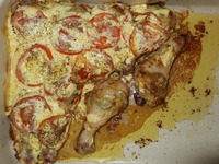Смазываем противень маслом, раскладываем грудки рядышком (можно кружочком, чтоб им веселее было). Сверху выкладываем натертый картофель, предварительно по соленый и по перченый, Затем смазываем майонезом, как бы закрепляя все эту конструкцию, сверху кладем кружок помидорки на каждую порцию.