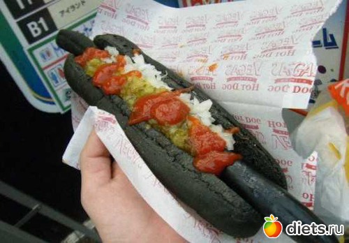Хот-дог черного цвета является одним из самых популярных фаст-фуд деликатесов, которые продаются в токийском районе Акихабара. Его длина превышает 30 сантиметров, а на приготовление такого шедевра, по всей вероятности, уходит несколько часов, а не минут, которых вполне хватило бы для того, чтобы сделать самый обычный хот-дог... Ресторан быстрого питания использует для приготовления своих удивительных хот-догов порошок древесного угля, который сделан из съедобного бамбука. Он часто используется в качестве красителя на территории Азии. Так что, судя по всему, устрашающий цвет кулинарного шедевра не несет никакого вреда для здоровья и, к тому же, не портит вкус булочки и сосиски. Оттого все больше гурманов стремится в японскую столицу, чтобы попробовать черный хот-дог, который, считают, очень заманчиво смотрится на рекламной витрине, и готовы платить за него 600 иен, что равно 6 долларам.