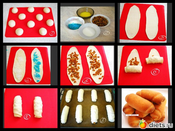 Вот сам рецепт теста: На 1 кг муки - 30 грамм свежих прессованных дрожжей, 13 грамм соли, 90 грамм сахара, 50 грамм сухого молока (если тесто на воде), 50 грамм масла подсолнечного, 1 яйцо, вода - 450 мл.