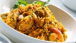 6. Добавить к рису и мясу овощи и грибы (кроме зелени петрушки), хорошо перемешать, посолить и поперчить. Накрыть крышкой и тушить при тех же условиях 3 минуты.