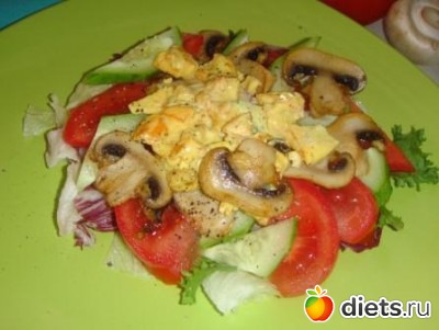Сверху выложить крупно нарезанные помидоры и огурец, посолить, поперчить, затем выложить обжаренные шампиньоны.
