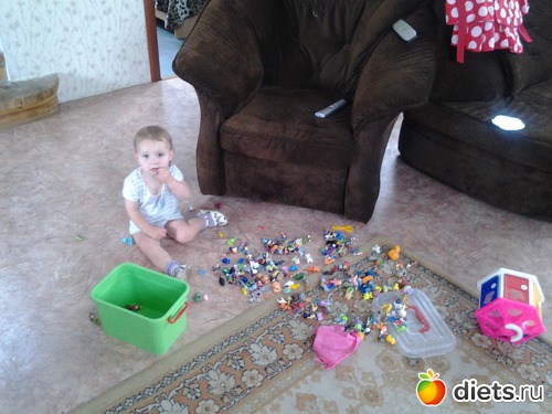 Младшая внуча очень любит раскидывать игрушки с киндеров. Они у нас хранятся в специальном ящичке. так она переворачивает этот ящик, а потом рукой разбрасывает их вокруг себя. И тут я вспомнила: хочешь похудеть, раскидай коробок спичек и поднимай по одной. А почему мне так игрушки не поднимать. Правда хватило меня только на 25