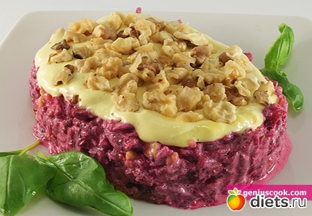 Смешать чеснок, свеклу, майонез и орехи. Посолить по вкусу.