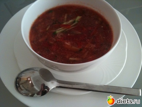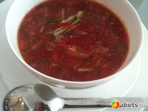• Разливаем суп в тарелки, брызгаем оливковым маслом и украшаем тремя отдельными фрагментами тонко нарезанных овощей - луком, паприкой, огурцом