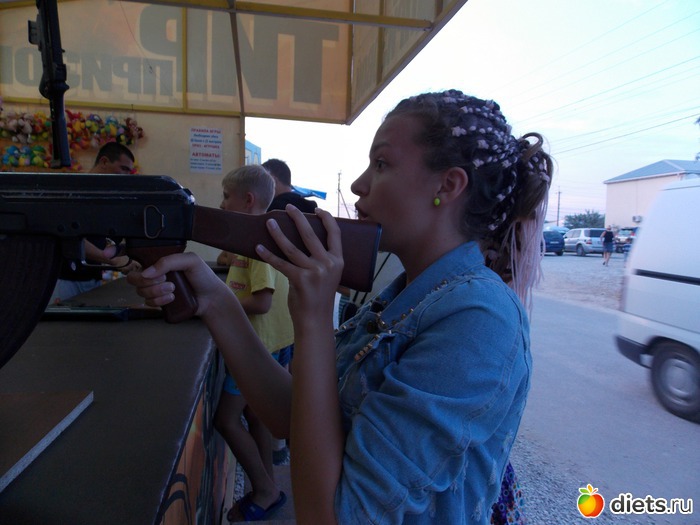 Старшая первый раз постреляла в тире. И в первый раз хорошо у неё все получилось. Из 20-ти банок попала в 19, ну и соответственно приз не получила