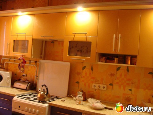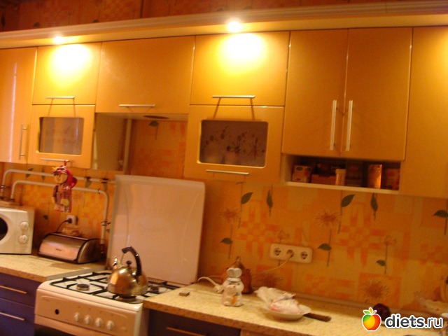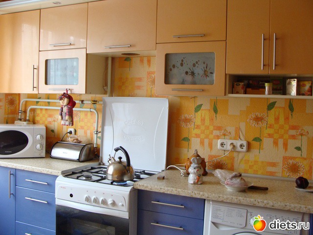 Кухонный гарнитур достался от старых хозяев. Состояние очень хорошее. Верх светло-оранжевый металлик, низ - светло-синий металик. Стекло матовое с узорами в виде кляксок.