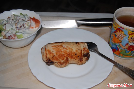 Мясо пожарила на тефаль без масла,творог смешала с натур иогуртом.Кстати наелась очень даже
