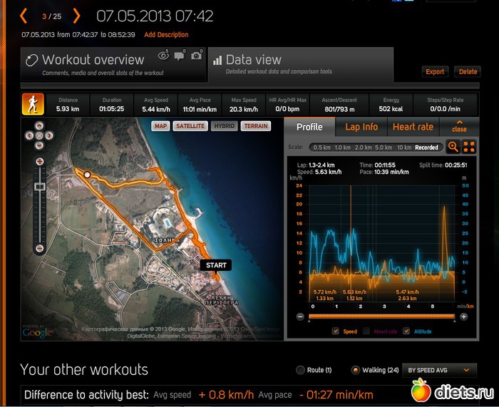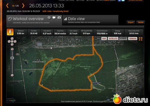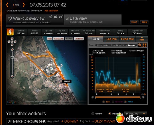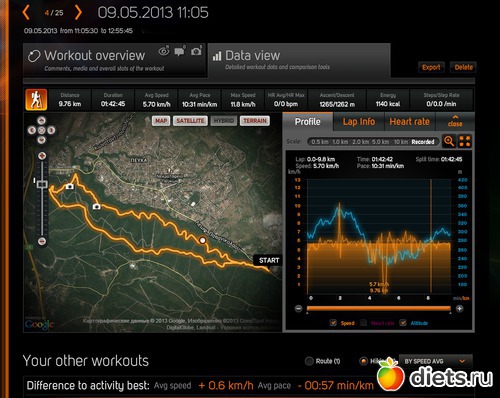 Друг поставил себе на виндоус-фон программку Sports-tracker, которая отслеживает с помощью GPS навигации вашу активность: пробежки, прогулки, велосипедные треки, лыжные походы. Определяет и скорость, и высоту, на которой маршрут проходит, и даже калории потраченные подсчитывает, исходя из вашего веса. По ходу дела можно фотографировать себя и окрестности, и потом на карте маршрута место, с которого была сделана фотография, будет зафиксировано. Очень удобная штуковина, я себе на айфон такую тоже скачала. Вот такие резюме дает программа по каждой тренировке: