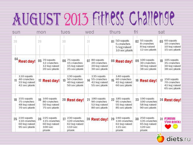 и еще с завтрашнего дня у меня новый фитнес-челендж. Теперь работаю над прессом а попа отдыхает) хотя для поддержания я ей выделила присядания. Буду рада всем кто присоединиться. Если страшно сразу так много присяданий, то можно их взять из предыдущего челенджа, там меньше и постепеннее