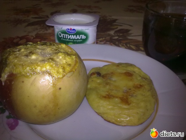 2 яблочка с творогом (+яйцо, банан, изюм и корица), 2 сырничка, йогурт 2%, черный чай