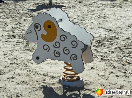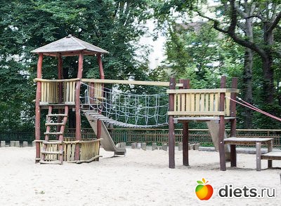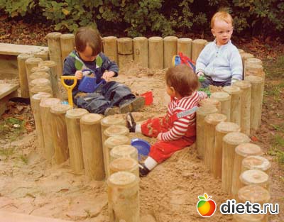 На длинной стороне, ближней к дому, можно установить качели на бревне (не стала искать картинку - обычная длинная доска, на противоположных концах сиденья, посередине что-то, чтобы она могла туда-сюда качаться);
