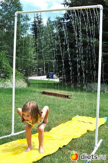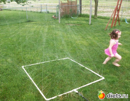 Посередине будет мобильный надувной бассейн. И еще брызгалка - обычная газонная. Или такая (можно сделать самим):