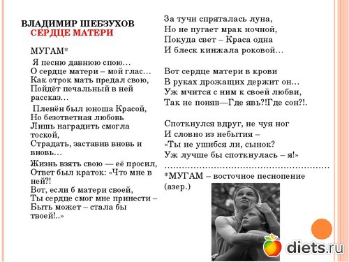 Совершенно потерялся парень и побрел домой. Рассказал он матери об этом условии красавицы. Все поняла тогда мать. И отдала своё сердце сыну. И побежал юноша со всех ног к красавице. Да так спешил, что споткнулся, упал и выронил материнское сердце. И разбилось оно на тысячу кусочков. И каждый из кусочков спросил: «Ты не ушибся, сынок?..»