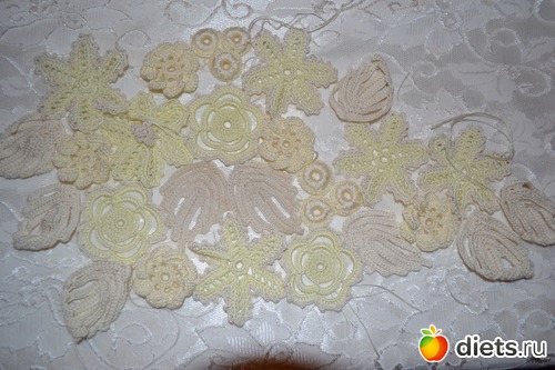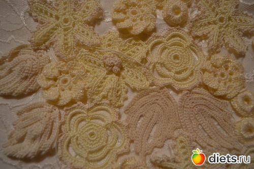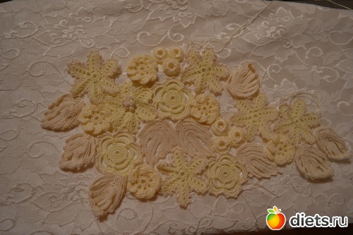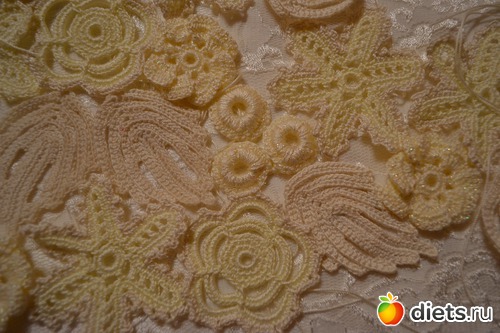 Эх, девочки, маюсь от безделья. Дел куча, а лень не дает даже встать с кровати. Начала ваять новое вечернее платье для своей малой. Решила в этот раз скомбинировать ирландское кружево и ткань. Купила ткань и даже навязала несколько мотивчиков. Верх - вязаный с высоким воротом и рукавом 1/2 до локтя. Юбка - ткань, в пол с кучей фатина внизу, завышенной талией и контрастным поясом тоже из ткань. Смотрите что у меня выходит. Критика приветствуется, идеи тоже.