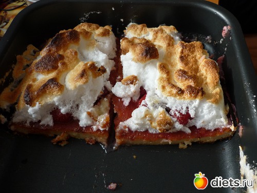 Сначала запекала тесто, потом выложила на него ягодки и сироп вишневым немного залила, сверху самый обычный белковый заварной крем и еще на несколько минут в духовку засунула)