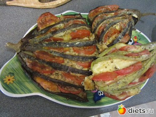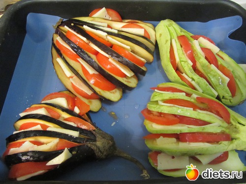Баклажан натереть солью, оставить на мин 15 затем залить холодной водой и дать постоять еще мин.15-20. Хорошо вытереть. Баклажан т кабачки, разрезать вдоль на полоски не дорезая до конца. Сыр нарезать на пластины, помидоры порезать полукольцами.